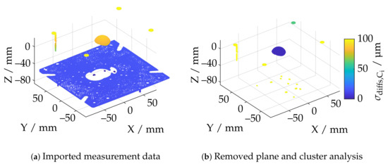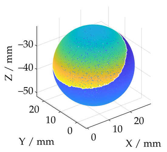 Figure 7b shows that, in the case of a measuring system with a large measuring volume, the remaining point cloud contains further geometric artifacts which are not part of the actual sphere. Based on the DBSCAN algorithm [51], this fragmented point cloud is divided into K corresponding clusters. Each cluster is then checked individually to determine whether it represents a sphere. For this purpose, a double Sphere-Fit with an inlier interval of is carried out in accordance with the specifications of VDI/VDE guideline 2634-2 [28] using a Least-Squares approach. The segmentation of a possible sphere is performed analogous to the procedure for the plane removal via the standard deviation of all deviations of the respective cluster in normal direction. This is illustrated in color in Figure 7b and demonstrates exemplarily that segmentation is feasible. If no sphere is found, the respective measurement will become invalid.