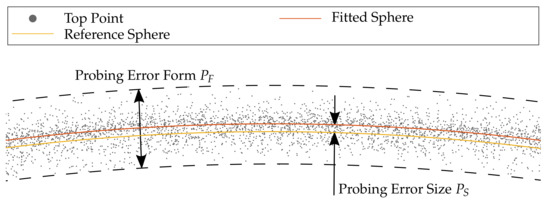 To quantify the quality of each reconstructed sphere within the measuring volume, the metrics of the probing error are applied according to VDI/VDE guideline 2634-2 [28]. As shown in Figure 8, it is required to differentiate between the probing error with respect to form and size. Thus, the probing error according to form represents the span of all deviations in normal direction after the numerical fitting of a sphere into the reconstructed point cloud. The span in the following refers to a confidence interval of . It should be noted that, in DIN EN ISO 10360-8 [31], the span is defined by 95% of the measuring points regarding probing positions within the cone angle. The probing deviation regarding size is the deviation of the reconstructed feature (diameter) from the calibrated diameter according to Table 2.