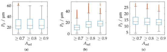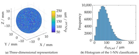 The relative sphere coverage is obtained by normalizing to the maximum that applies to all measuring poses. The determination of is dependent on the size of the sphere and the number of generated reference samples n, which both influence the mean distance to the respective next neighbor within . The histogram in Figure 10b shows the sample grid distance of the reference point cloud for the corresponding sample number and diameter. The threshold is set to 1.5 , i.e., about 125 µm. The determination of is based on a further NN-classification within where the nearest neighbor was searched, which is not the same as the initial point. It has been observed experimentally that it is possible to achieve good comparability from a masking of the dataset at and, thus, remove sensor positions if the total reconstruction is too small.
