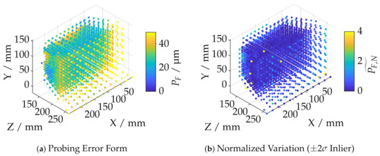 The ISO/IEC guideline 98-3:2008 [57] (also referred to as JCGM 100) recommends 20 repeated measurements for each sensor pose in order to compensate for stochastic influences on the measuring result. This is not feasible due to the high number of measuring poses (n ≈ 5.000) per measuring system with regard to absolute experiment duration and generated data volumes. In order to correct the data of implausible outlier measurements, additional outlier masking is performed. Let the probing error : be a function which maps each sampled reference point to a corresponding probing error value. A subset with of all points for each sample point