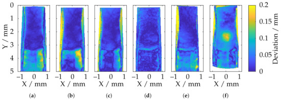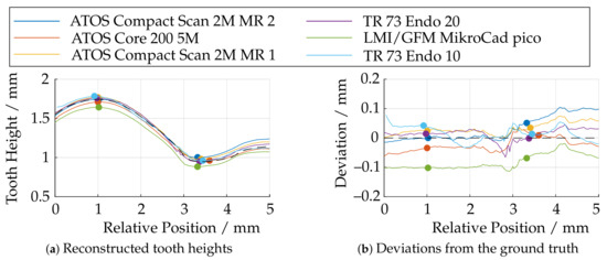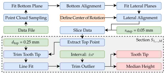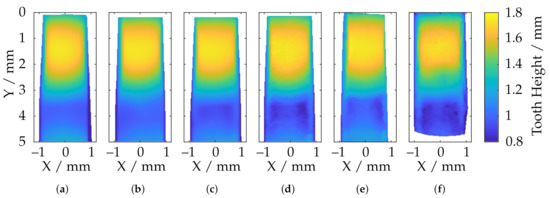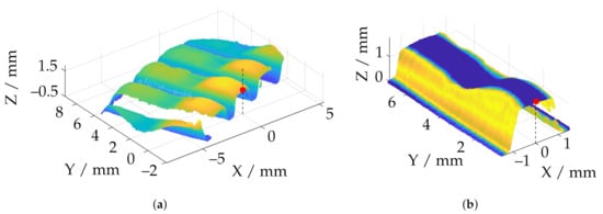 For the rotation around the Z-axis (dashed line in Figure 16), a center of rotation is manually assigned from the dataset. Translational shifts can be corrected and optimized later (see Section 7). For the subsequent lateral alignment, the deviation of the fitted planes from an ideal symmetrical alignment with respect to the YZ plane is then minimized. The minimization is based on the widely used nonlinear solver through the Levenberg-Marquardt algorithm [61,62]. Figure 16b shows a final aligned and trimmed example measurement. It can also be observed that the height profile of the tooth derived from the geometry is very uneven along the Y-axis. Due to the different forming forces and the demonstrator characteristics of the formed workpiece, uniform height profiles over the entire tooth are not available. Nevertheless, the tooth height is an important parameter for characterizing the forming process.