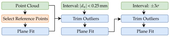 In the subsequent step, the tooth base is aligned. Approximately, in smaller sections, this can be considered as a plane. The plane is first prealigned via a subset of six manually assigned points by estimating an optimal rotation and translation using partial fraction decomposition via the approach of Kabsch et al. [60]. In the next iteration, a subset of all points in which deviation in normal direction to the manually assigned plane is smaller than 0.25 mm are applied for a two-step total least squares fitting according to Section 4 with inlier. The algorithm for plane fitting with manual assignment is shown in Figure 15. For the following registration of the reconstructed data after the base plane has been defined, the lateral surfaces are extracted from the data (Figure 16b). For this purpose, the algorithm described in Figure 15 is applied separately for each lateral surface.