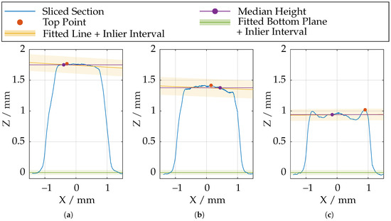 Therefore, the geometry is divided into different sections, with distance = 0.05 mm and evaluated separately. According to Figure 14, the point with the largest Z-coordinate is selected, and a line is fitted into the data points with maximum distance = 0.25 mm. The fitted lines are shown in Figure 17 for different slice positions. To obtain a unambiguous height coordinate, the median is extracted from the data points in a inlier interval of the fitted line. The points in this interval are also used to subsequently reassemble the entire geometry of the tooth tip from the individual sections.