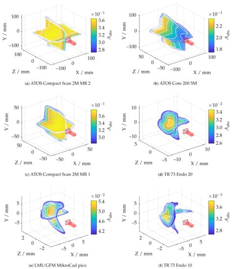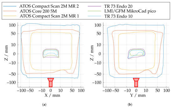 Figure 18 illustrates the measurement ranges with respect to the absolute spherical coverage . The sensors, shown in red, were aligned so that the triangulation base is located in the ZX plane. represents the best possible usability of the measurement volume with respect to maximum reconstructable geometry. The scale effect can be observed well, since varies from about 0.38% to 38%. It can also be observed that the ATOS Core 200 5M has a slightly more non-uniform measuring volume than the ATOS Compact Scan 2M. In the area of the smaller scales, all sensors show a more significant influence of field curvature, which results in curving of the measuring range to a spherical segment in Z direction. This effect is most significant with the LMI/GFM MikroCad pico sensor and should always be taken into account when positioning the instrument. On the other hand, the maximum sphere coverage of about 5.4% is the highest in this scale range. The endoscope with 10 mm working distance (TR73 Endo 10) shows a comparatively inhomogeneous shape of the measuring volume. This may be due to the optics used with a comparatively low depth of field which also results in a significantly reduced sphere coverage. The TR73 Endo 20 sensor has a more uniform appearance of the measuring volume with the same triangulation angle and and a much higher maximum sphere coverage. Figure 19 shows the shape of the measuring range according to cross sections from Figure 18 for a fixed threshold value of . Thus, it can be observed that the measuring range in the plane of the triangulation base is considerably more symmetrical, larger, and more uniform. Perpendicular to this, especially the endoscopic sensors show a certain directional orientation.