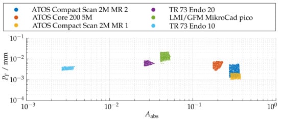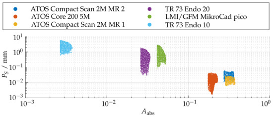 represents the total area of a reconstructed pose. It is, however, to be noted that this information always refers to a sphere with a fixed diameter according to Table 2. In addition, many measuring systems do not require the entire measuring range (MR) to reconstruct the sphere for each measuring pose. This suggests that should not be considered equal to the maximum reconstructable surface area of each measuring pose. Nevertheless, there is a good proportionality between the maximum possible surface reconstruction and the relative sphere size , which is, therefore, used in the following as the main reference for limiting the measurement volume in terms of reconstructable surface area.