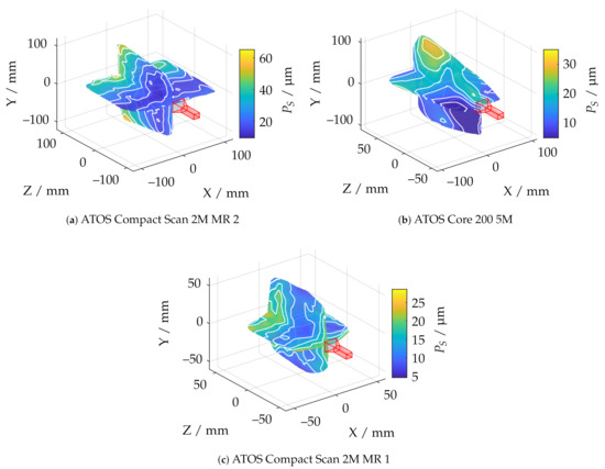 The uncertainties of the commercial 3D scanners of GOM GmbH (Table 1) were determined by the manufacturers using VDI/VDE 2634-3 [27] in combination with DIN EN ISO 14253-1 [29]. Due to the available uncertainty data and the large number of measurement positions, a separate measurement uncertainty analysis can be dispensed with. Weickmann [58] examined the probing uncertainty individually for each point depending on the relative surface inclination. The results show a deterioration of the uncertainty with increasing inclination angle, but no correlation of the uncertainties with the measurement positions.
