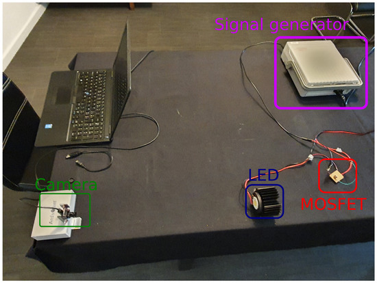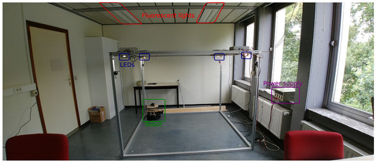 In order to evaluate the proposed calibration procedure, we used the same experimental setup as our previous works [13,41] (see Figure 2). Four VLP transmitters were mounted at a height of approximately 1.5 m. Light intensity of every transmitter was modulated by a Metal-Oxide Semiconductor Field-Effect Transistor (MOSFET) that was connected to a signal generator. Every LED had a unique frequency between approximately 1.5 kHz and 5 kHz, so that both low and high frequency modulation can be evaluated. The complete methodology used to obtain suitable transmitter frequencies was detailed in [13]. Table 2 lists the selected modulation frequencies, along with the other main hardware specifications.