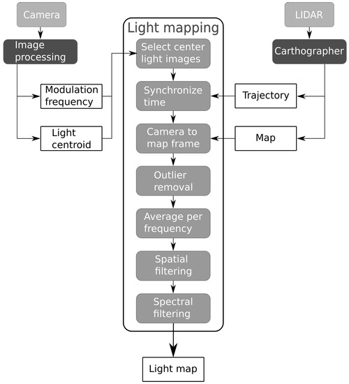 Figure 4 provides a graphical overview of the calibration procedure. The parameters used to obtain the results in Section 4 are listed in Table 3. The initial steps of the improved procedure were still the same as in [13]. Due to the rolling shutter of our Complementary Metal-Oxide-Semiconductor (CMOS) camera, modulated light sources are visible as stripe patterns in the images. The width of the stripes is proportional to the transmitter frequency [42]. The complete image processing pipeline is detailed in our previous work [13] and returns the frequency and pixel coordinates of the lights as output. The effects of lens distortion are largest at the edges in a picture. Therefore, only the images where a light was detected close to the image center were processed further. Measurements of the laser scanner were used to reconstruct the followed trajectory and a map of the environment by using the Google Cartographer SLAM algorithm [43]. By combining the trajectory of the robot with the detected light sources, we obtained a map of the environment with the light source locations relative to the map frame.