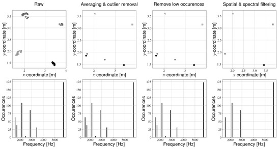 We now propose a different method, whereby we filter the light sources based on their physical coordinates and the frequency spectrum. The intermediate results of the processing steps can be seen in Figure 5. First, outliers are removed from the detected coordinates per frequency. Outliers are defined as detected positions that have a distance of more than 2 standard deviations from the average position. Then, the coordinates of the remaining light sources are averaged per frequency. Light sources that were only observed a few times are removed. Next, light sources that are close to each other are combined. Filtering is first performed based on the coordinates of the light sources. Whenever the distance between two transmitters is below a certain threshold (Table 3), the LED with the lowest number of observations is removed. In case both lights have an equal amount of detections, their detected frequencies and positions are averaged. We call this step “spatial filtering”. Finally, we combine light sources of approximately equal frequency. Whenever the distance in the frequency spectrum of two light sources is below a certain threshold (Table 3), the frequency with the largest number of observations is kept and the other is removed. Similar to the spatial filtering step, we average the frequencies and positions of light sources with an equal amount of detections. We call this final step “spectral filtering”. The result of these additional processing steps is a light map with the correct number of transmitters. The number of light sources therefore no longer needs to be known beforehand. Instead, one only needs to know (approximately) how far lights are minimally spaced apart, which is much easier to obtain.