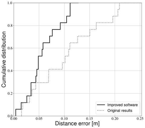 Figure 6 compares the calibration results obtained in [13] with the method proposed in this paper. It is clear that the additional filtering steps significantly improve the calibration accuracy. On average, light sources can now be detected with an accuracy of approximately 6 cm, compared to 11 cm in [13]. Larger improvements are also visible in the higher percentiles of the distribution. More than 80% of light sources can be positioned with an accuracy of 10 cm, compared to 20 cm in [13]. Note that the same experimental data were used to obtain both error distributions; the difference is therefore purely due to improvements in data processing.