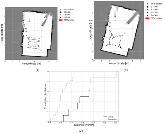 Calibration experimentswith different trajectories. (a) Zigzag trajectory. (b) Stop and go trajectory. (c) Cumulative error distribution.