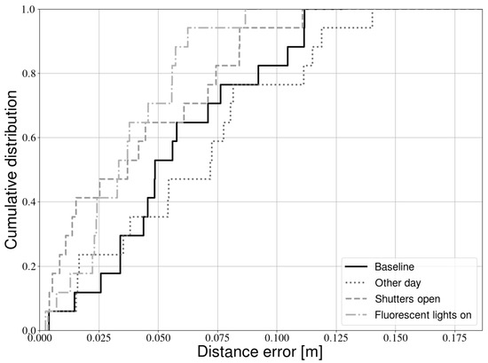 For every condition, three experiments were again conducted with the stop and go trajectory. For every experiment, we determined the error on the light source location as explained in Section 3. Figure 9 shows that all conditions have similar performance. The “other day” experiments are very similar to the baseline, indicating that the parameters (e.g., exposure time) are not overfit to a specific point in time. The difference between both error distributions generally is not larger than 2 cm. Whether or not the shutters are opened also does not seem to negatively impact calibration accuracy, as unmodulated light sources are easily ignored by our calibration procedure. Similarly, we can observe that switching on the fluorescent light has little impact. While fluorescent light is modulated, the frequency is too low compared to the LEDs. Therefore, the additional light sources are simply ignored.