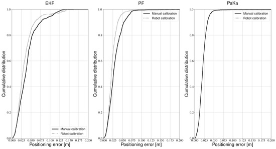 First, we calibrated the setup with the configuration that was determined to be the best trade-off between position and frequency accuracy. More specifically, we used an RPi camera with a field of view of 60 degrees and drove the robot in a stop and go trajectory. This setup was also calibrated manually as a point of reference. In our previous work, we described sensor fusion based robot positioning with three filters, namely an Extended Kalman Filter (EKF), a Particle Filter (PF) and a hybrid Particle/Kalman filter (PaKa) [41]. We now use the parameters from both the manual and robot calibration in these positioning approaches. We used all data from the conditions described in Section 4.2.3. Positioning accuracy results were obtained in the same way as described in [41]. Contrary to previous sections, “positioning accuracy” does not refer to the accuracy on the position of the transmitters. In this section specifically, “positioning accuracy” refers to the accuracy on the robot position, the calculation of which is described in [41].