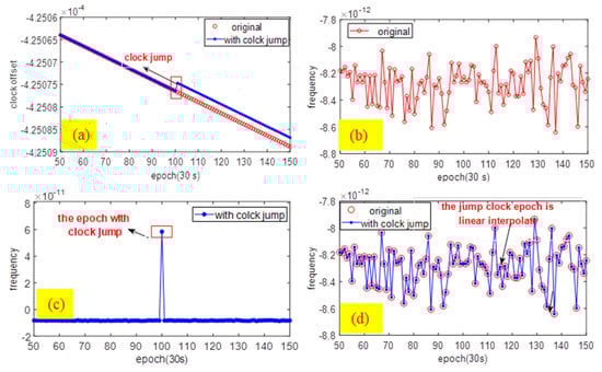 As per the red part of Figure 1a and Figure 1b, the original clock and the frequency have normal status (clock jump); the blue line shows a clock jump at the 100th epoch. Consequently, the frequency series (Figure 1c) has an abnormal jump at the 100th epoch, which is obviously inconsistent with other epochs. This epoch was treated as a gross error, after which we preprocessed the clock series by linear interpolation.
