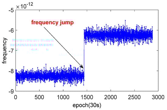 However, the frequency jumps in Figure 2, for satellite clocks, occurred for three reasons [21]: (i) the phase jump in the master control station, (ii) operation frequency modulation to maintain frequency accuracy, and (iii) the switch of the on-board clock (the switching of the clock might be reflected in the change of frequency slope). Thus, the analysis of this situation should be divided into two parts.