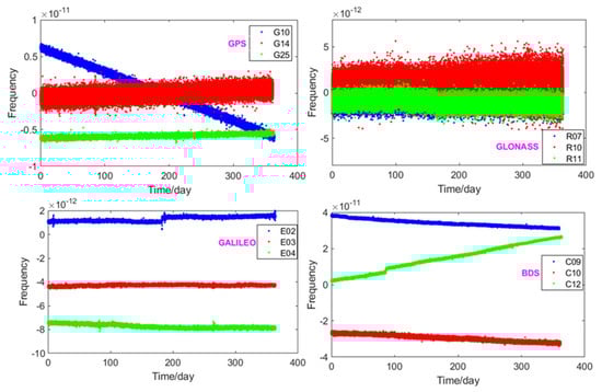 The GLONASS’s stability revealed an exponential linear change with the increase in the averaging time and each clock showed good consistency. This was due to the fact that the GLONASS are equipped with the same type of Cs atomic clock. The GLONASS’s stability was maintained at 10−12–10−13 for τ = 100 s, while for τ = 1000 s and one day, it was at 10−13 and 10−14, respectively. From the results, we find that the short-term (τ = 100 s) and medium–long-term (τ = 10,000 s) stability of GPS, Galileo, and BDS were at the level of 10−13 and 10−14, which was nearly one magnitude of superiority in performance compared to that of the GLONASS. The day stability of BDS and GLONASS was maintained at 10−14; thus, it was worse than 10−15 for GPS and Galileo. Overall, the stability of GPS and Galileo was better than that of BDS and GLONASS.