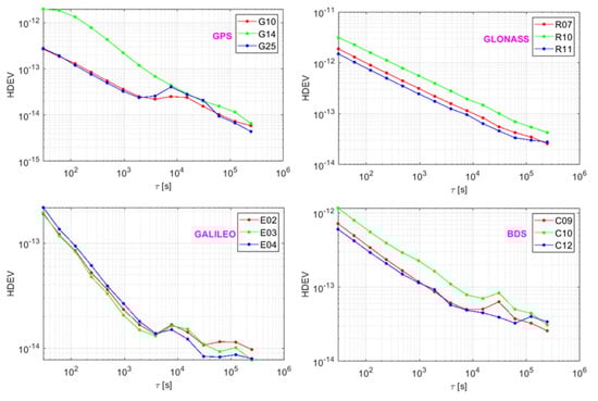 As shown in Figure 4, the stability of the BDS was consistent between satellites; it was approximately 10−13 at τ = 100 s and τ = 1000 s, while for 10,000 s and τ, it was one day (τ = 86,400 s), and the result was in the order of 10−14. For Galileo, it was 10−13 for an average time of τ = 100 s, and 10−14 for τ = 1000 s and τ = 10,000 s, respectively, and the day stability was at the magnitude of 10−15. The GPS clock G10 and G25 (IIF Rb clock) had a magnitude superior to that of the G14 (IIR Rb clock) with the τ = 30 s to τ = 1000 s; thus, the IIF Rb clock was more stable than the IIR Rb clock. On the other hand, the G14 has a long orbit operation of nearly 20 years [12,22]. The GPS stability of τ=10,000 s was in the order of 10−14, and it was around 10−15 for τ = 1 day. With the increased averaging time, the number of sampling nodes decreased, and there was a small fluctuation in frequency that led to the fluctuation of stability. Similar to the trend of the GPS, the Galileo and BDS slowed down, and the stability curves were non-monotonic from the average time of τ = 10,000 s.