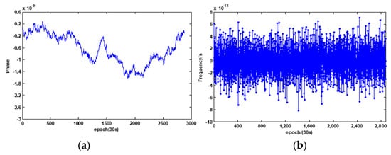 To validate the feasibility of the lag1 ACF method, a simulation of a phase data with a noise level of 3 × 10−12 τ −1/2 (averaging time is 30 s) is shown in Figure 5a, which corresponds to the frequency in Figure 5b.