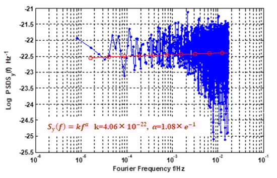 The analysis of the PSD (power spectrum density) of the simulated data is presented in Figure 6. As shown in Figure 6, the slope of the PSD (α = 0.108) is categorized as WFM noise (α = 0), as in Table 1.