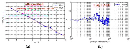 The fitting value of the classical Allan variance method can be found in Figure 7a, which is derived from WFM noise (, around −1). Thus, this method can roughly determine the noise type. Additionally, as in Figure 7b, the results of the lag 1 ACF methods (α is range of , around to 0) are generally consistent with those of the PSD algorithm. However, the method of lag 1 ACF can obtain the noise information for each averaging time automatically.