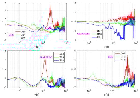 The second-order stationary condition can be mistaken for the noise of G10 and E02; when the averaging time is around 2 × 104 s, the index of noise type α shows a local maximum. This is owing to the satisfaction of the stationary status ; the time series should make a difference between epochs, so then the value of d changes to d + 1, which will cause the local jump of p for the formula .