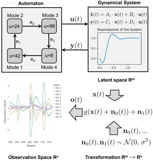 General concept of the CPS data generation model: An automaton (e.g., containing four modes ) interacts with a dynamical system. Its control values force the dynamical system to move its response towards the control values. While performing this movement, the internal states , that define the order of the dynamical system change their values according to Equation (1). As the automaton cyclically evaluates whether from Equation (2) is true, mode changes are triggered automatically. The resulting trajectory of is then transformed trough the nonlinear mapping function (Equation (3)) into the observation space .