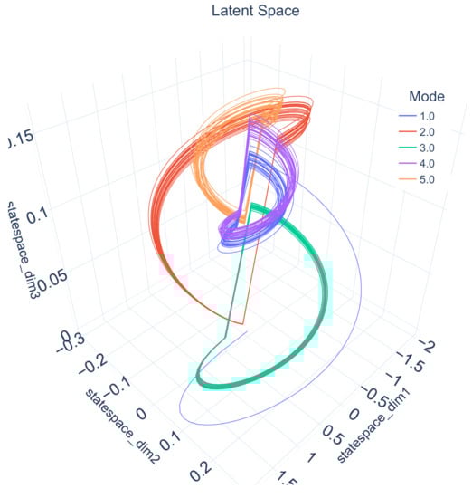 The latent space of of a third-order dynamical system over 25 cycles of a five-mode automaton. Every dimension of is shown as an axis and allows a graphical interpretation of the internal dynamics of the dynamical system from Equation (1). The colors indicate the trajectory taken to follow the commands within the automaton’s modes. It can be seen that each state has a unique shape.
