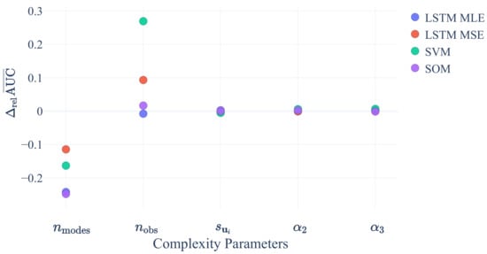 Relative difference of average area-under-the-curve (AUC) values (see text for exact definition) as a function of five parameters that are relevant for data complexity.