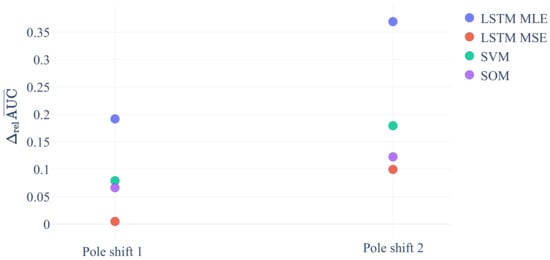 Figure 5 shows the previously defined values for variations in pole shifts. Pole shift 1 denotes the increase of the pole shift from 0% to 19%, and pole shift 2 denotes the increase from 10% to 37%. Since all values of are positive, we can conclude that an increase in pole shift generally improves the performance of all algorithms in detecting anomalies while LSTM MLE profits most. It follows our intuition that the LSTM MLE method performs well with this type of error as it is a dynamical method. Through the ability to learn a difference equation of the normal ODE, it can easily detect changed gradients in the unacceptable dataset.