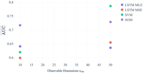 We conclude that variations in , and have a minor impact on the AUC values below 1% for all ML algorithms. However, an increase in the number of modes from 5 to 15 results in a decrease in the AUC by 10% to 25%. As expected from intuition, a larger number of modes increases the difficulty of detecting anomalies. In contrast, increasing the number of dimensions in the observation space from 10 to 50 increases the AUC by about 27% for SVMs and about 10% for LSTM MSE. Thus, it becomes easier for those algorithms to detect anomalies if information from more dimensions becomes available. While SOMs still profit from an increase in dimensions, although on a low level of the order of ∼2%, the ability of the LSTM MLE algorithm to detect anomalies is decreased by about 1%. The cause of this is subject to future investigations.