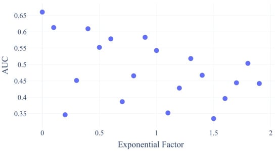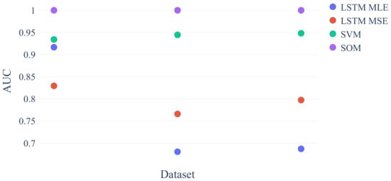 Figure 7 shows that the performance of the LSTM MLE Method decreases as the non-linearity increases through the exponential factor in Equation (3). Future work will investigate why some of the results are below an AUC of 0.5.