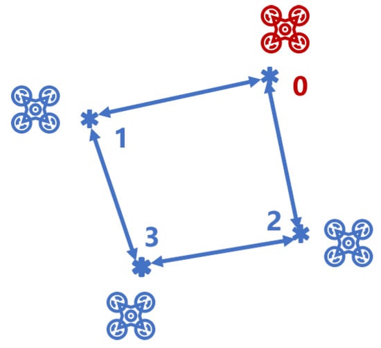 For the group of UAVs, the UAV that can access its global position is the leader, say node 0, and all others are followers labeled by nodes . UAVs exchange location estimates only with their neighbors through ultra-wide band (UWB) communication modules. The communication topology can be described by a undirected topology graph, i.e., the UAVs as the vertices of the graph. They only communicate with their neighbor UAVs that are within the communication range, as shown in Figure 1.
