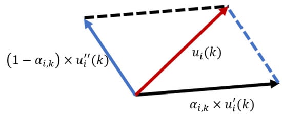 To achieve the goal, the control input is considered to be comprised of two parts. One is obtained by minimizing the locational optimization function , which is used for area coverage. This part is represented by , and the corresponding cost function is formulated as follows: