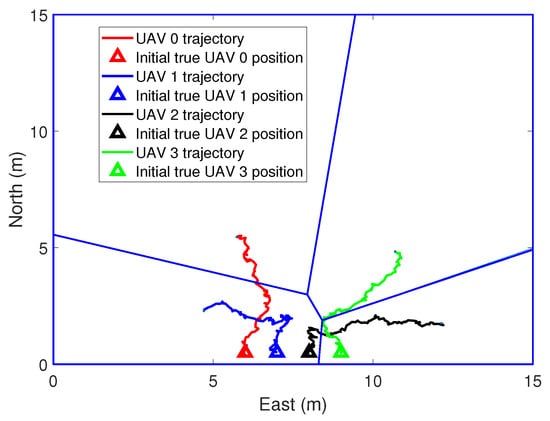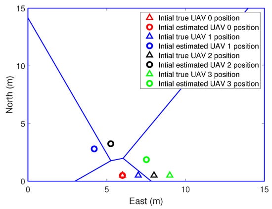 where denotes the position estimate of UAV i at time step k and is the control input of UAVs. When all UAVs move to their targets, which are the corresponding centroids of their Voronoi partitions, UAVs exchange local information with their neighbors. The UAVs use the local information to update the Voronoi partition and target point in a given frequency. The group does not hover in place until the errors between the current estimated position and target position of every UAV are less than a predefined threshold.