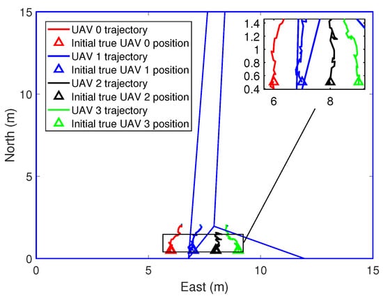 In the case that the UAVs’ location is not known a priori, the techniques of positioning already exist in both simulation and actual flight [,,,,,,,,,,]. In [], the authors proposed a method of passive detection of a moving aerial target by using heterogeneous satellites. In [], methods of mode transition in the integrated navigation based on heterogeneous sensor integration were presented. In [], the authors developed a method to reliably track many small rigid bodies with identical motion-capture marker arrangements. In [], the authors presented a technique for multi-UAV localization using ranging measurements from Two-Way Time-Of-Flight UWB transceivers. However, the agents here must depend on some external infrastructure for positioning, relative localization techniques can be adopted to solve the location-based tasks, and the techniques do not need external infrastructure. In [], the authors proposed a visual relative location (RL) algorithm, which is based on pattern detection using onboard cameras, to estimate the position of their agents. Their algorithm uses a combination of flood-fill techniques, which provide both high speed and precision for RL, but the performance of the algorithm is limited by the range to the target and lighting condition. In [], the authors proposed an RL algorithm by using distance and odometry measurements to study the single landmark docking problem. The proposed method can achieve both autonomous approaching and landing tasks in GPS-denied environments. This experiment proves the feasibility of the RL algorithm for position estimation by using a single landmark. In [], the relative position between neighboring UAVs is obtained by using UWB and visual odometry. Combined with the extended Kalman filter (EKF) strategy, it is successfully used to compute the global position of UAVs. In [], the authors proposed a consensus-like relative localization scheme to estimate the relative position between the agents; the numerical simulations show that the relative position estimate exponentially converges to its true value. However, there is no discussion on the influence of measurement noises. In [], the authors fused the obtained direct and indirect RL estimates by using a consensus-based fusion method to generate the relative positions. Their proposed RL estimation was applied to formation control.