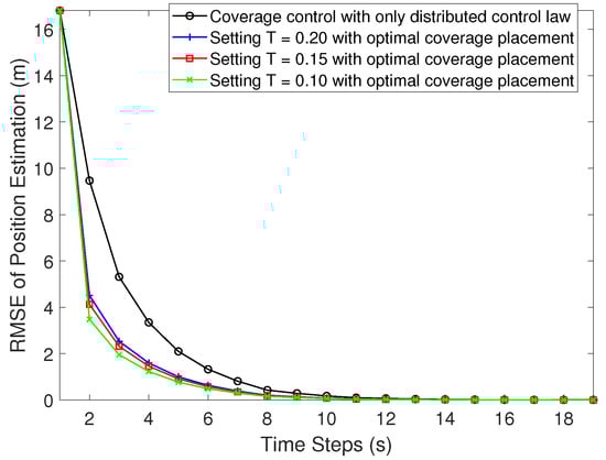 The relative localization performance results are shown in Figure 6. The root-mean-square error (RMSE) is utilized as the localization accuracy metric. From the figure, we can see that the RMSE of the position estimate of follower UAVs converge to 0 gradually and remain accurate until convergence of the coverage task. We choose different values of T (threshold used in the weight setting in (36)). Compared with the one without considering the control input originated from the localization optimization, by using the join force strategy (35), localization performance is better.