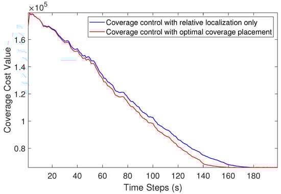 We also compared the change in coverage cost value with other published approaches. Our work considers the coverage with relative localization of UAVs and optimal UAV placement. As shown in Figure 7, the coverage performance is better using the approach we proposed.