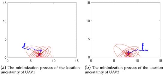 The minimization process of the location uncertainty. Blue lines represent the flight trajectory of the UAVs. The red ellipses represent the corresponding depict of the location uncertainty in each step.