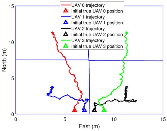 In this section, the performance of the coverage algorithm proposed in this paper is evaluated using the simulation tests. The parameters used in the simulations are listed as follows: 4 UAVs are assigned randomly in the given square region for coverage task. The size of the coverage area is 15 m × 15 m. The UAVs move at an average speed of 0.2 m/s, and the communication frequency is 10 Hz. In the global position estimation KF algorithm, the process noise is set as . In the relative location estimation EKF algorithm, and , and the displacement measurement noise and . The velocity of UAVs and the communication frequency are obtained from our real experimental equipment. The gaussian noise of position estimation is obtained from our truly flight test. The approach we proposed has a complexity of because the matrix inverse calculation is involved in the process of position estimation. The average computing time ranged from 0.013 to 0.028 s, and the processer used was Intel i7-1165G7.