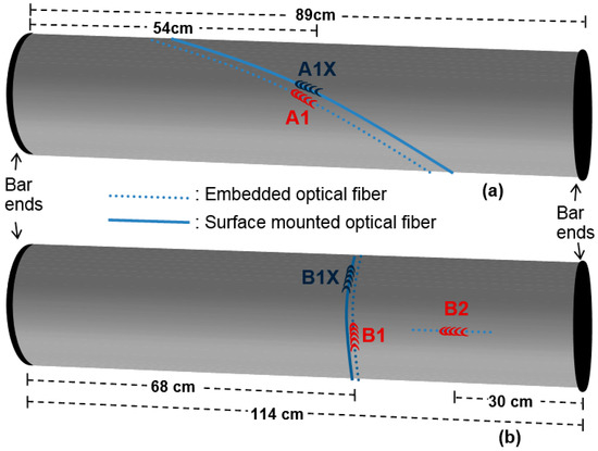 Location and orientation of fiber Bragg grating (FBG) sensors along (a) shaft A, (b) shaft B. Surface-mounted gratings (A1X, B1X) are illustrated in blue, while embedded gratings (A1, B1, B2) are in red. The shaft’s nominal diameter is 49.5 mm; the schematic is not to scale.