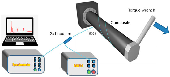 Conventionally, torque in a rotating shaft can be measured directly by in-line torque transducers [18], which, however, suffer from high cost, may induce unwanted vibration to the system, and usually can accommodate only limited torque ranges. Indirect torque measuring approaches rely, mainly on the measurement of surface strain and subsequent torque calculation [19]. These systems offer the advantage of direct mounting of the sensors (usually strain gauges) on the shaft without the need for shaft modification or disassembly while exhibiting good accuracy at a relatively low cost. FBGs perform very well as strain sensors, and their use for torque measurements in aluminum tubes has been previously demonstrated by Gao et al. [20], with externally attached FBGs, in which the effect of sensor orientation was also discussed. Furthermore, Leal-Junior et al. [21] have incorporated polymer FBG arrays [22,23,24] in a series elastic actuator’s spring for angle, quasi-distributed displacement, and torque sensing.