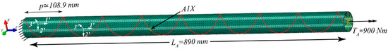 Assuming that the Bragg reflection-peak shifts correspond to the normal axial strains applied on the optical fibers (birefringence and peak split are practically absent for the examined gratings), then the corresponding normal strains from the FE simulations need to be derived. Thus, a partition with the direction of the optical fibers with surface-mounted FBGs A1X and B1X (see Figure 2 for FBG nomenclature) was created on shafts’ geometry in order to facilitate the definition of the local coordinate system and consequently evaluate the local normal strains . The partition for optical fibers of FBG A1X was implemented using the equation of a helix (see also Figure 4) as follows: , where is the pitch of the helix, is helix’s angle defined by the positive helical twist direction, i.e., for the ply angle, and is the external diameter. This helical partition allows only quadratic tetrahedral elements (Abaqus C3D10) to be employed. The global element’s edge length was 5 mm, while a secondary partition was created with elements of half size to average the strains along the corresponding gaging length (5 mm), using measurements of five nodes and two elements (the reader may also refer to Figure 10 in Section 4.2). The same meshing pattern was used on shaft B for uniformity, even-though the optical fiber was positioned in a circumferential manner. For shaft A, the model comprised ~30,300 elements and for shaft B ~41,300.