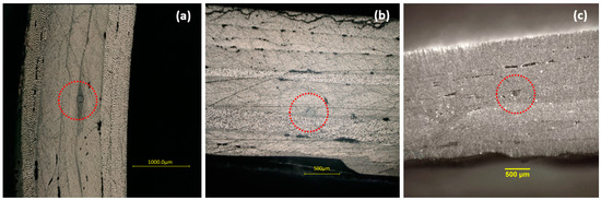 Microscope images of cross sections of the composite specimens at the location of the embedded fibers: (a) 0° FBG B2 (b) 55° FBG A1 (c) 90° FBG B1. The cross section of the optical fiber can be seen at the center of the red dotted circles. All sections were made at angles normal to the corresponding optical fiber direction.