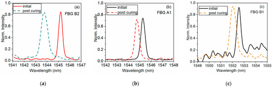 For the FBG placed parallel to the reinforcing fibers, the signal depicts a clear blue shift without shape deformations as shown in Figure 6b. For the other two orientations, the blue shift is accompanied by peak broadening due to non-uniform or non-axial residual stresses. Specifically, the bandwidth of FBG B2 is almost doubled (increased by 87%), while the broadening is smaller for FBG B1, with an increase of 46% observed in its full width at half maximum (FWHM).
