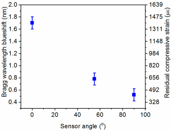 Bragg wavelength blue shift and corresponding residual compressive strain after thermal curing for different sensor orientations with respect to the shaft axis (0° indicates a sensor parallel to the shaft axis). The error bars represent the 0.2 nm hardware resolution of the spectrometer.
