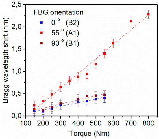 Shafts A and B were manually subjected to increasing levels of torque up to 800 Nm, as described in Section 2 (see also experimental set up in Figure 3). During the measurements, the metallic fittings of shaft B that allow attachment of the shaft with the torque wrench, detached at a torque level of 550 Nm, limiting the envelope of measurement for this shaft to a lower range. The recorded Bragg wavelength shifts for the three embedded FBGs are illustrated in Figure 8 and all gratings exhibit a positive linear wavelength shift. Based on the slope of the linear fit of Figure 8, the sensitivity for each sensor orientation is calculated. In particular, the grating embedded parallel to the carbon reinforcing fibers (55°) exhibits a sensitivity of 3.6 pm/Nm (with linear regression, R2: 0.977), while the sensitivities recorded for the other two orientations are indistinguishable from each other within the experimental error and of a lower value around 0.8–0.9 pm /Nm (R2: 0.948–0.956). As indicated from the results, the sensor oriented parallel to the carbon fibers wound at 55° exhibits the higher sensitivity in monitoring torque-induced strain. Specifically, the sensitivity recorded is more than 4× times higher than the other examined orientations. No significant variation in sensitivity was recoded between sensors placed longitudinally and circumferentially to the shaft. As analyzed later, this is mainly attributed to the fact that FBGs are calibrated to measure normal strains and not shear ones.
