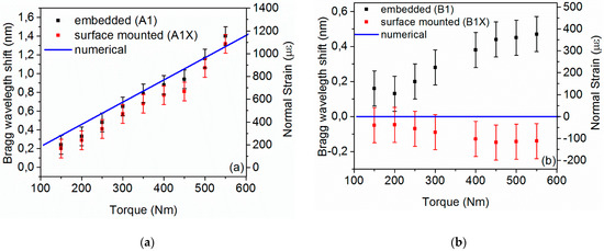 Bragg wavelength shift and corresponding normal strain for embedded (A1, B1) and surface-mounted (A1X, B1X) gratings under increasing torque; (a) FBGs at 55°, A1 and AX1 of shaft A and (b) FBG at 90°, B1 and B1X of shaft B. The error bars represent the 0.2 nm hardware resolution of the spectrometer.