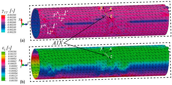 Strain profile resulted from the numerical FE simulations of shaft A for a torque of 900 Nm; (a) in-plane shear strains (at the discrete 1′–2′ planes tangent to the shaft), and (b) normal strains in the z-direction of the local coordinate system around the A1X FBG. The z-direction is tangent to the optical fiber at the A1X location.