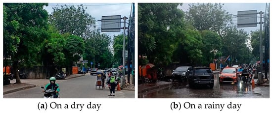 Figure 1 illustrates how weather change causes traffic congestion at Jalan Pegangsaan Dua, Jakarta, Indonesia. Figure 1a,b show the traffic condition on dry and rainy days, respectively. This road is a representative example of many roads in Jakarta with no or inadequate sewer systems. As shown in Figure 1a, the road has mild traffic congestion on a dry day. However, many puddles are generated when it rains, as shown in Figure 1b. These puddles will eventually develop as potholes and create slippery roads. As a result, drivers tend to slow down to avoid a potential traffic accident, which ultimately creates traffic congestion on the road.