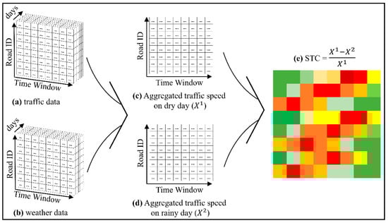 Finally, the STC matrix, illustrated in Figure 2e, can be calculated to present the speed drop scale caused by weather change. Based on Equation (2), STC is calculated by the scaled difference between and where and are traffic speed matrices under dry and rainy weather, respectively. Obviously, STC ranges from 0 to 1 because , and both are positve values. Here, 0 indicates 0% traffic speed drop caused by the weather change. It also means the traffic speed is invulnerable to the weather. On the contrary, 1 means the road traffic completely stuck due to the raining condition.